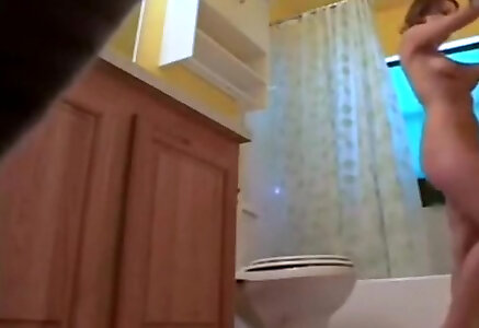 adorable blonde avec un manchon glabre lubrifiant ses seins épais dans les toilettes