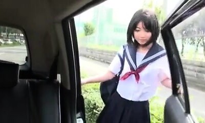 Clean-shaved pussy of lovely Japanese college girl Ami Oya is poked doggy